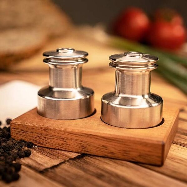 Het nautische peper- en zoutvaatje van Swi-TEC is een nautisch geïnspireerd accessoire voor aan boord of thuis. Het vaatje, uitgevoerd in de vorm van een lier en gemaakt van RVS, is geschikt voor gemalen peper en zout. Het vaatje is beschikbaar als los item of als set op een elegant mahonie houten plankje.