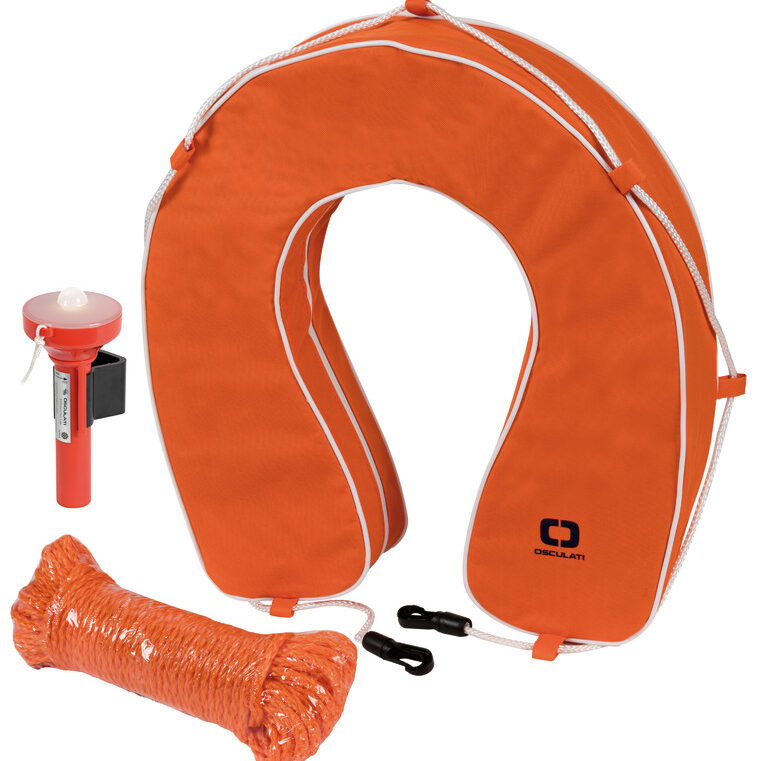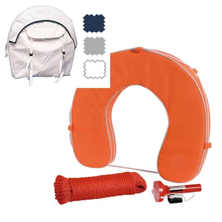 Deze complete reddingsboei set is een essentieel veiligheidsmiddel op ieder schip. De oranje hoefijzervormige boei wordt geleverd met een drijvend LED reddingslicht en een UV-bestendige reddingslijn van 8 mm dikte en 30 meter lang. De stevige hoes, verkrijgbaar in wit, grijs of navy blauw, beschermt de boei en accessoires tegen UV-straling en vuil.