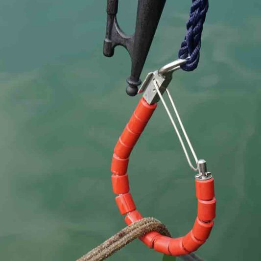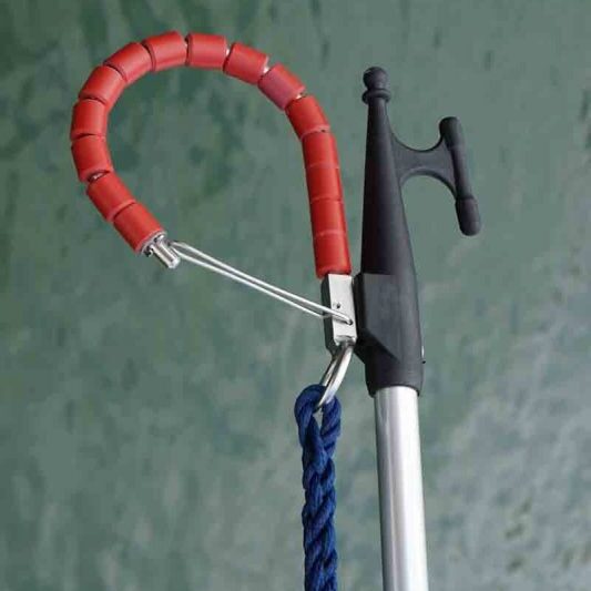 Mooringhaak van RVS en kunststof voor snel en veilig aanleggen. Inclusief 5 m lijn en kunststof rollen voor soepele geleiding.